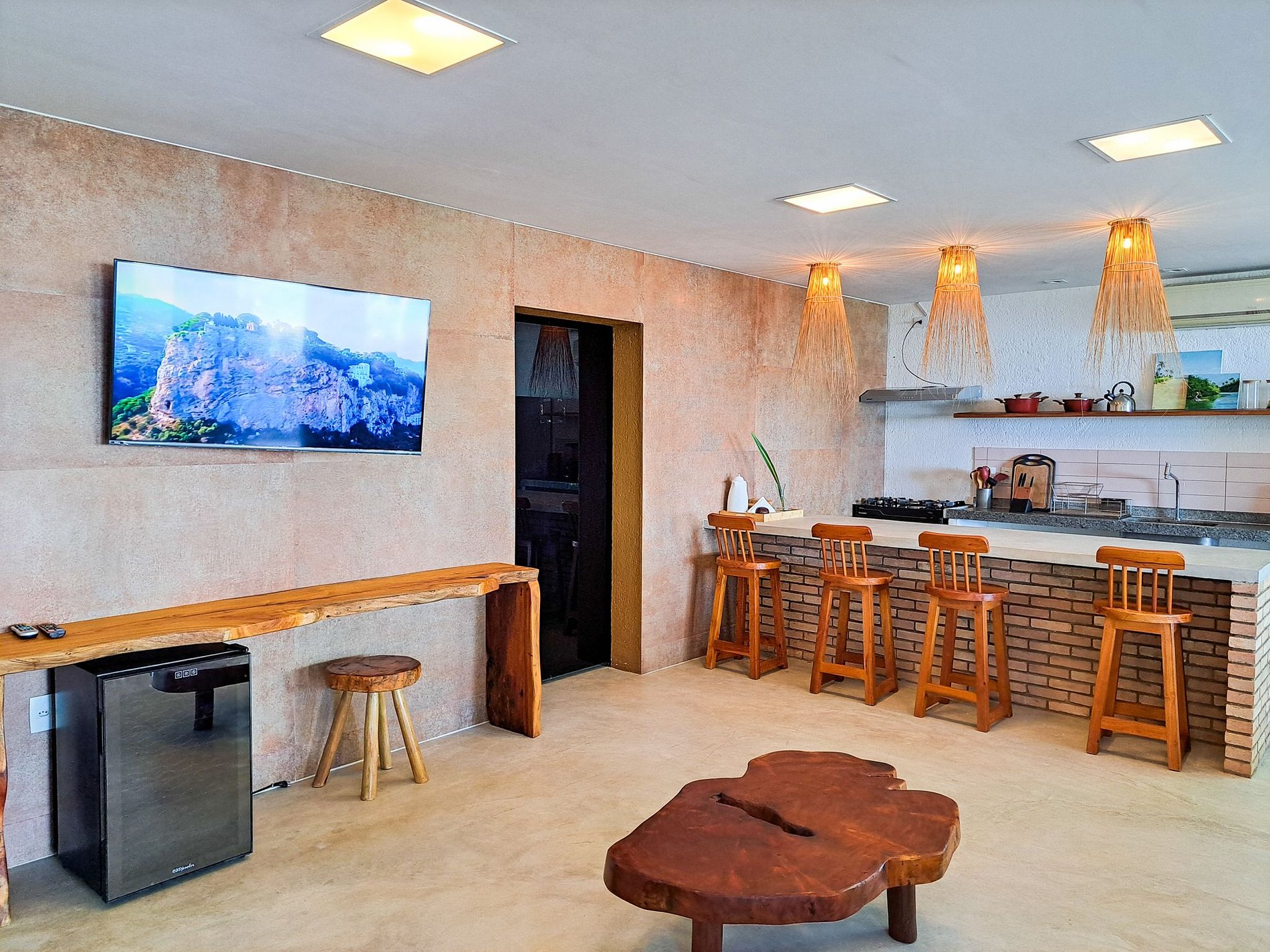 Upon arrival, you are greeted by a spacious outdoor area that harmoniously combines rustic and modern elements. The infinity pool, with its crystal-clear waters, integrates perfectly with the landscape, providing a breathtaking view of the ocean and the horizon. Strategically positioned sun loungers invite guests to lie in the sun and enjoy moments of pure serenity.