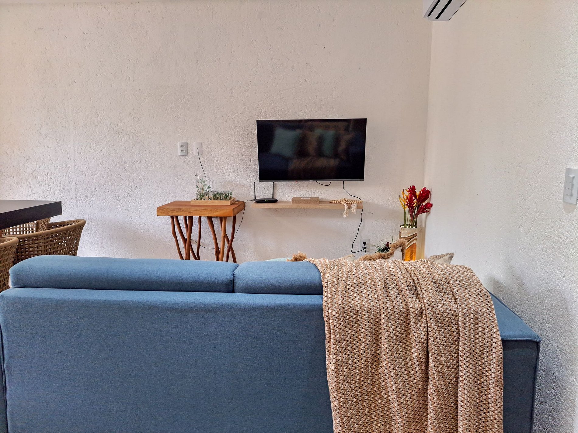 Acogedor salón con sofá y TV para sus momentos de descanso y entretenimiento.