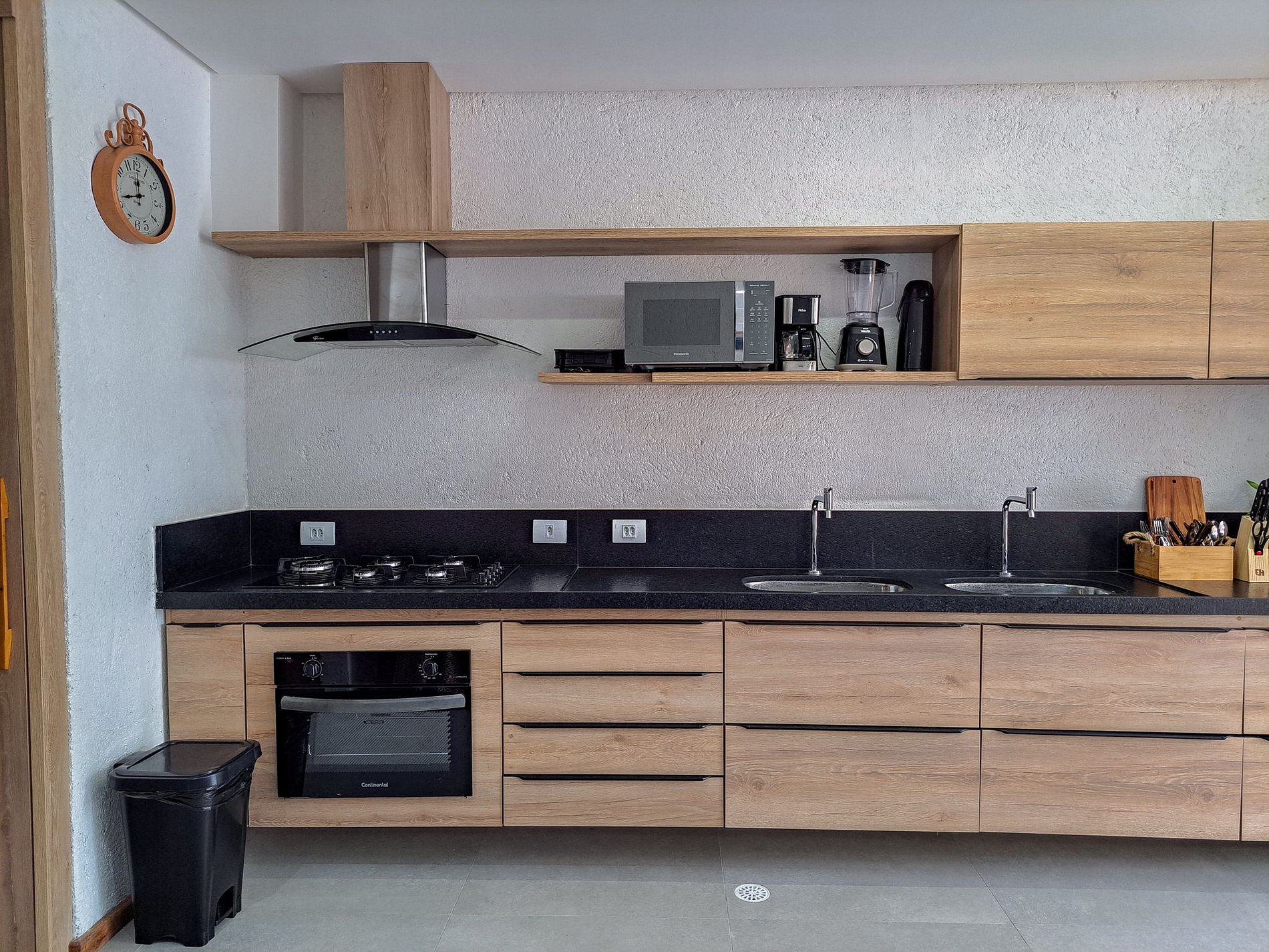 La casa también cuenta con una cocina integrada y totalmente equipada, ideal para preparar comidas con practicidad
