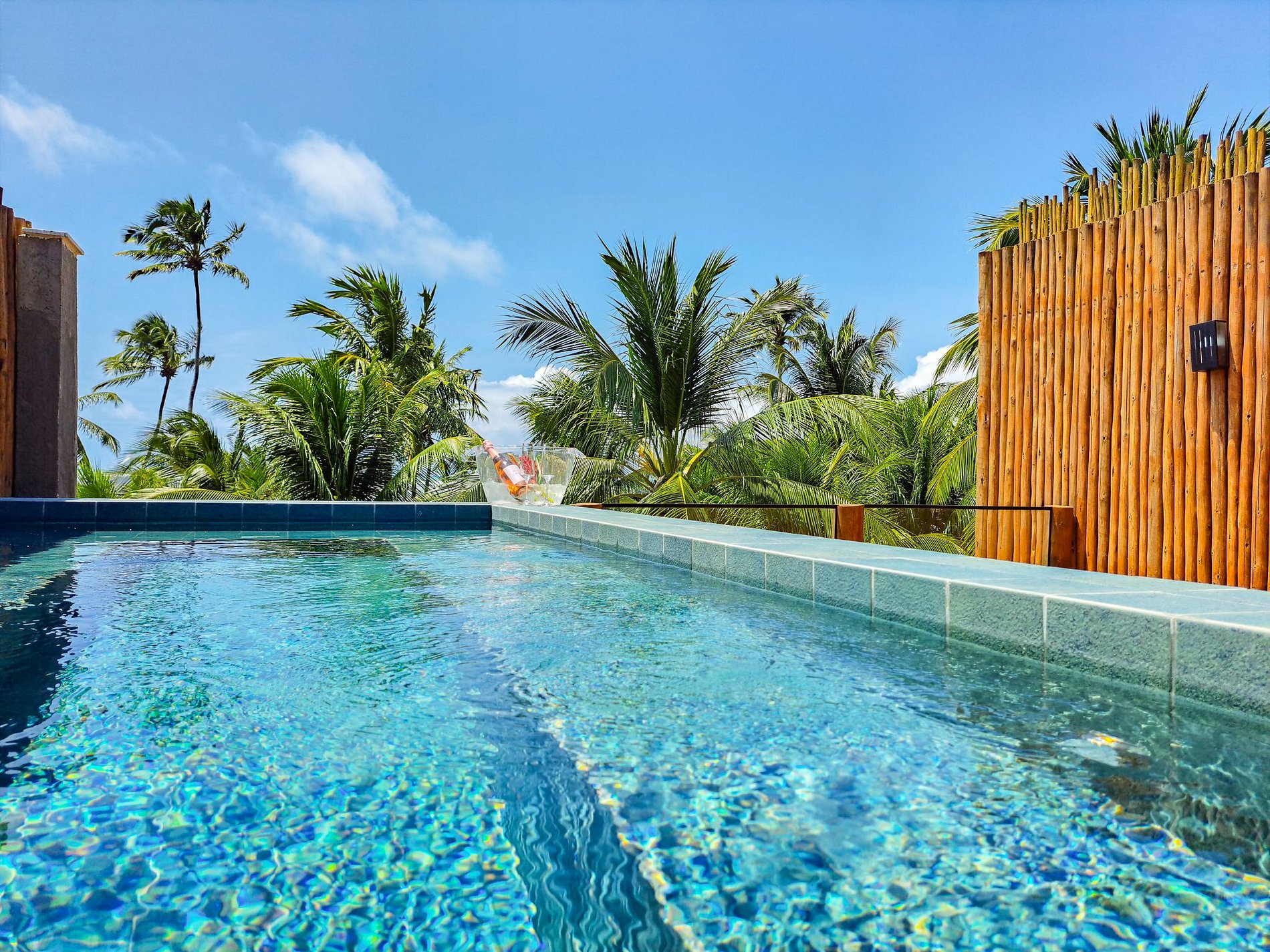 La casa cuenta con cuatro cómodas suites, una terraza en la azotea con vistas a la playa, piscinas privadas y espacios integrados que brindan bienestar y comodidad.