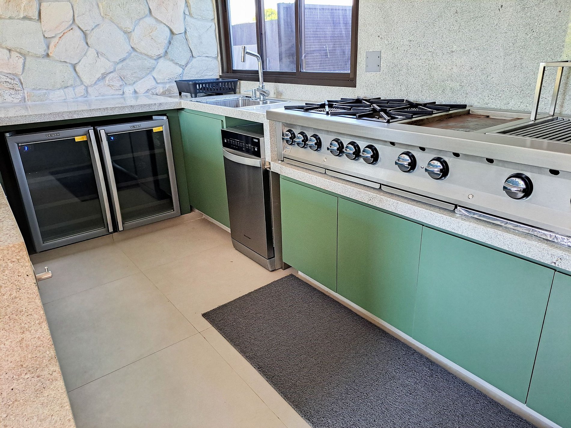 > Área gourmet impecable, equipada con cocina industrial y barbacoa empotrada