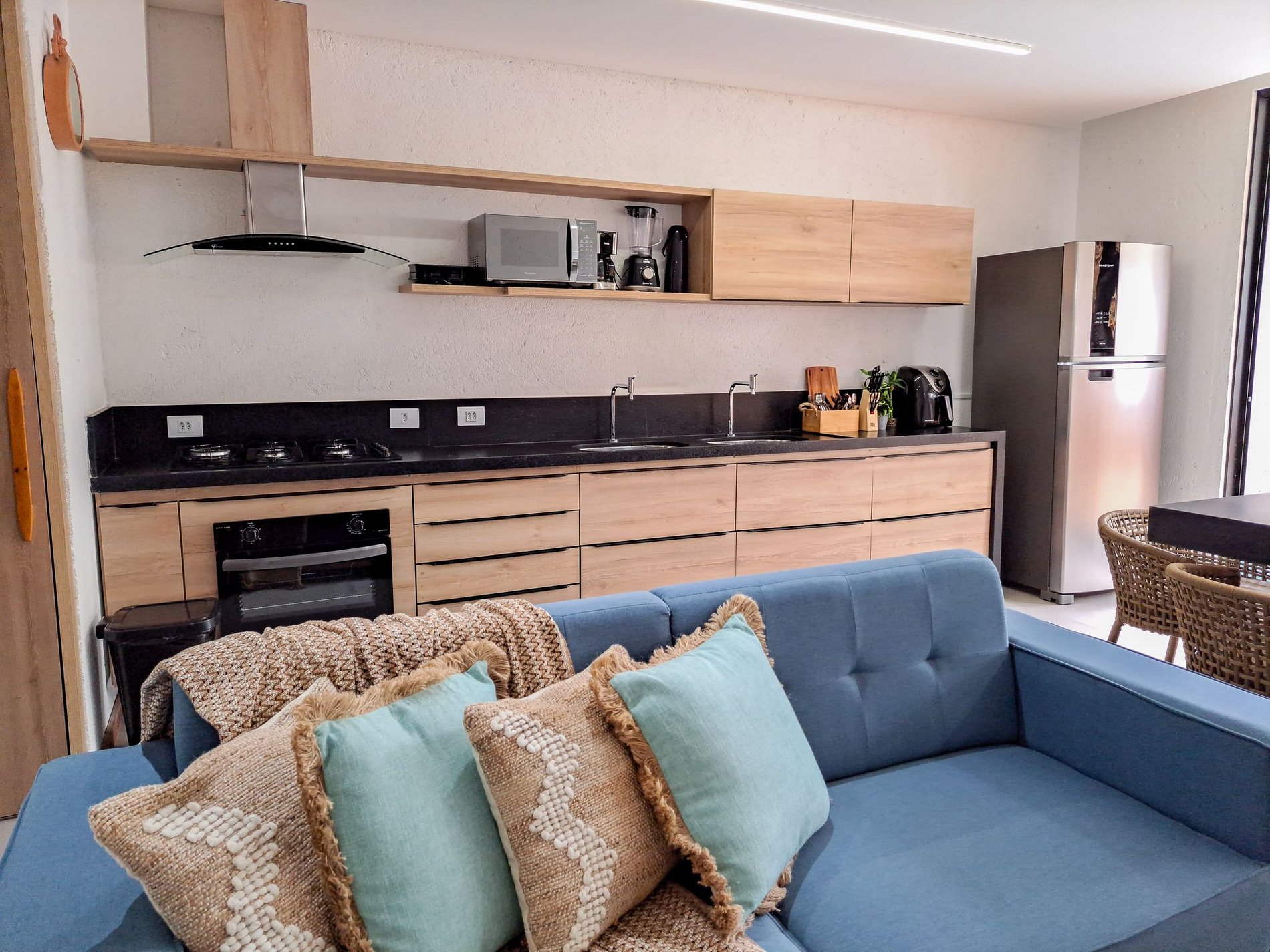 Ambiente funcional e equipado com os utensílios necessários para refeições práticas durante a estadia. Ideal para quem gosta de cozinhar e se sentir em casa.