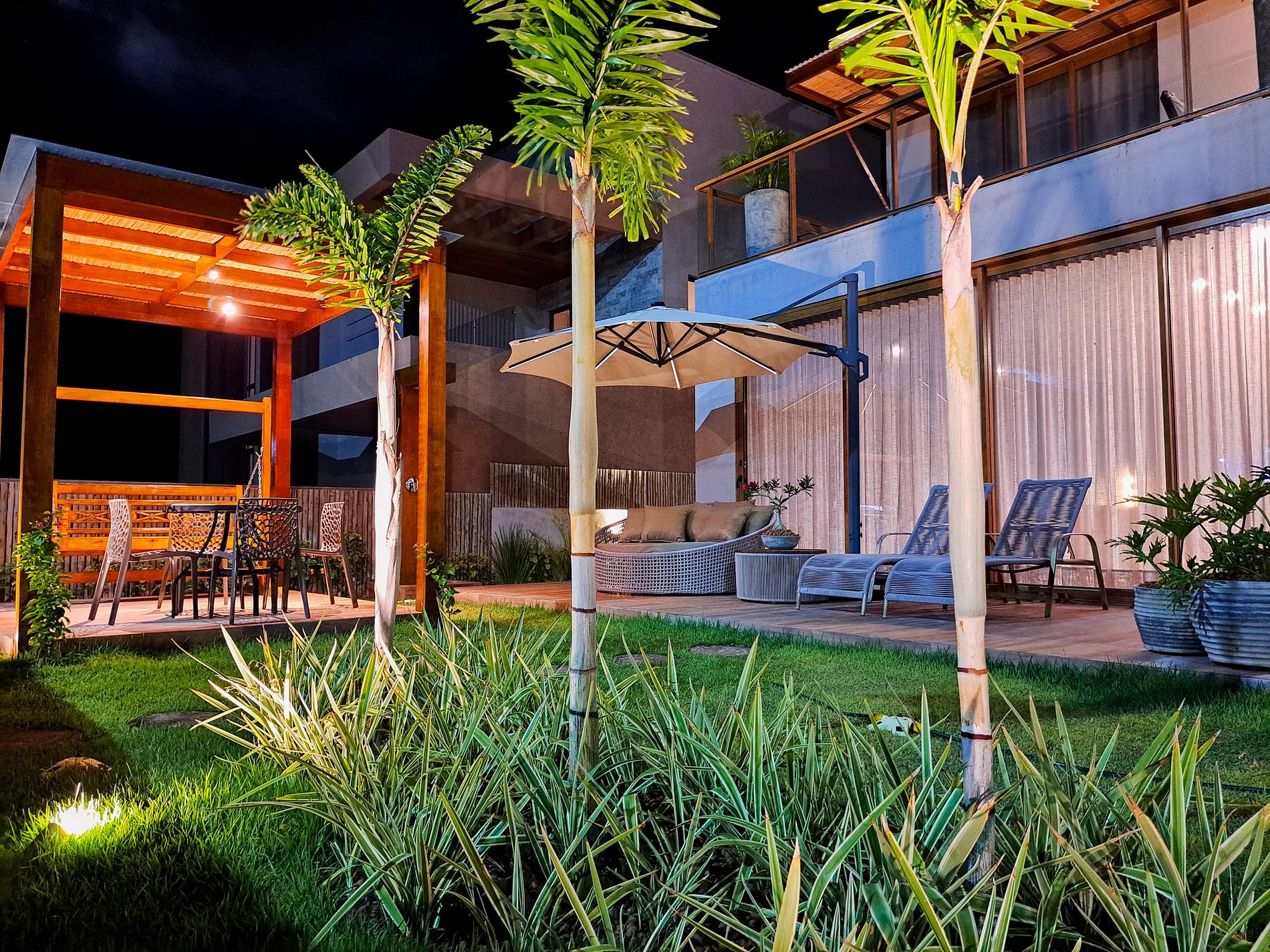 Jardim com deck e gazebo para relaxar