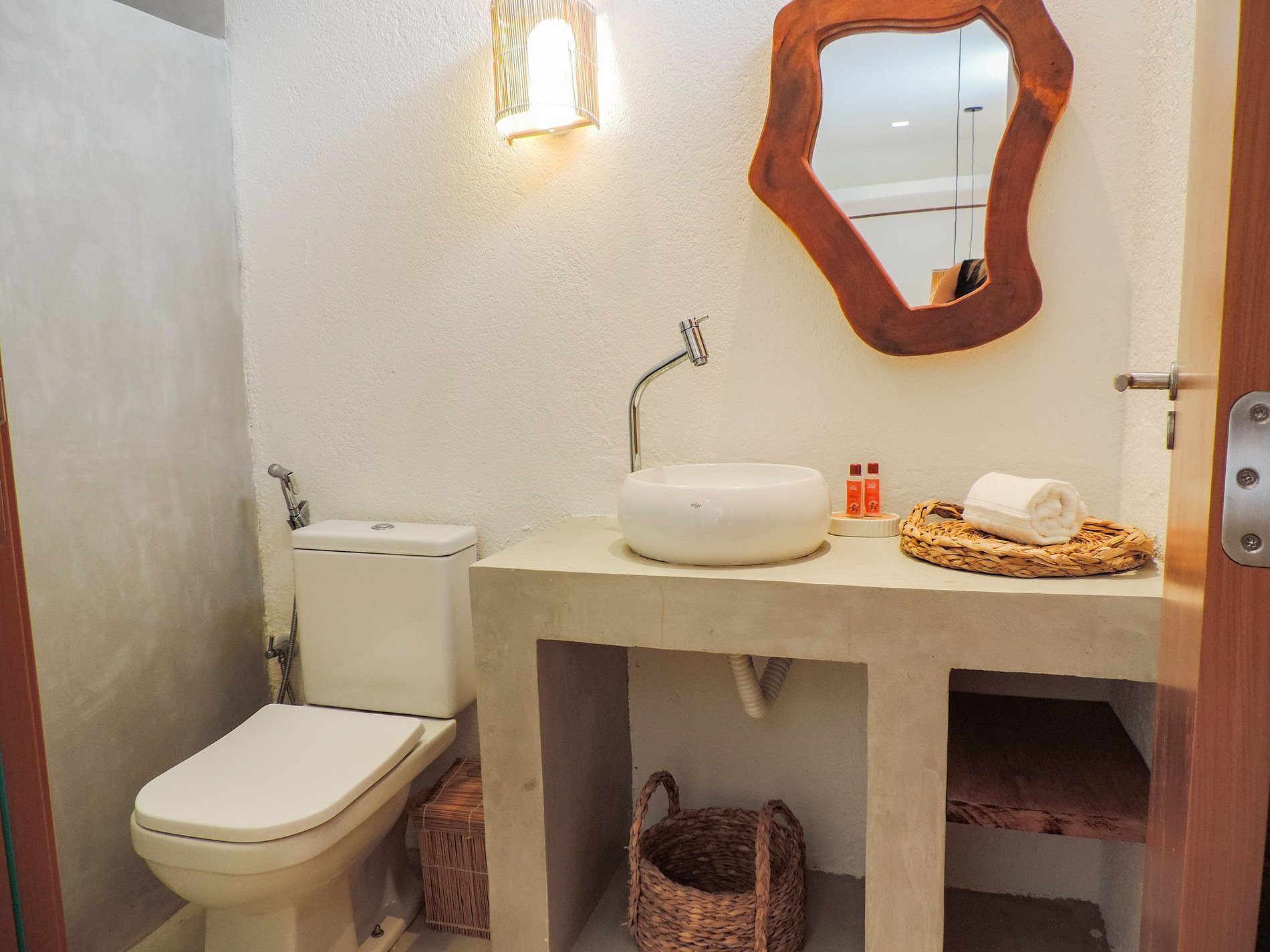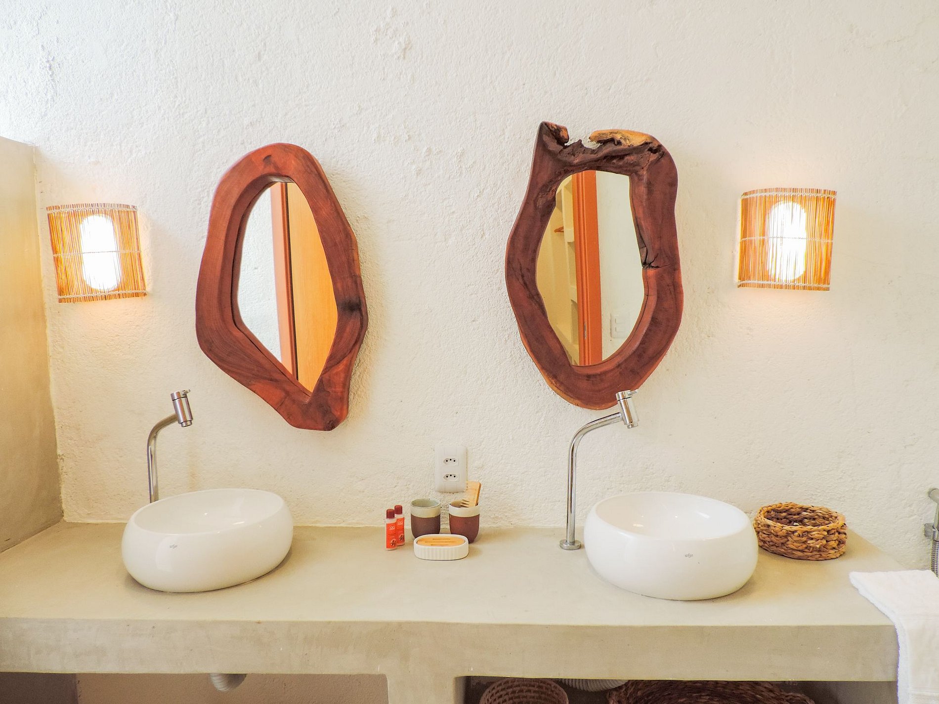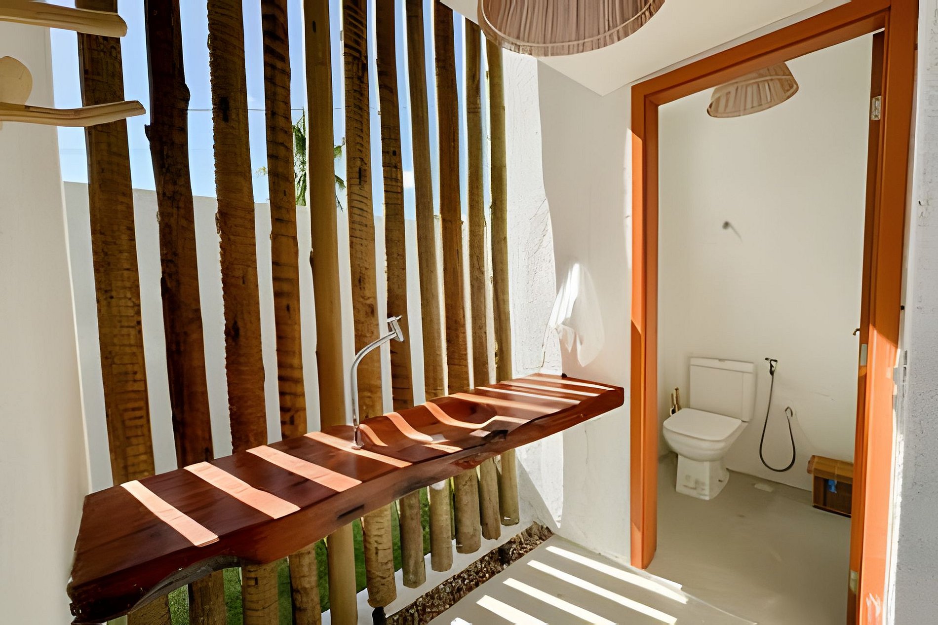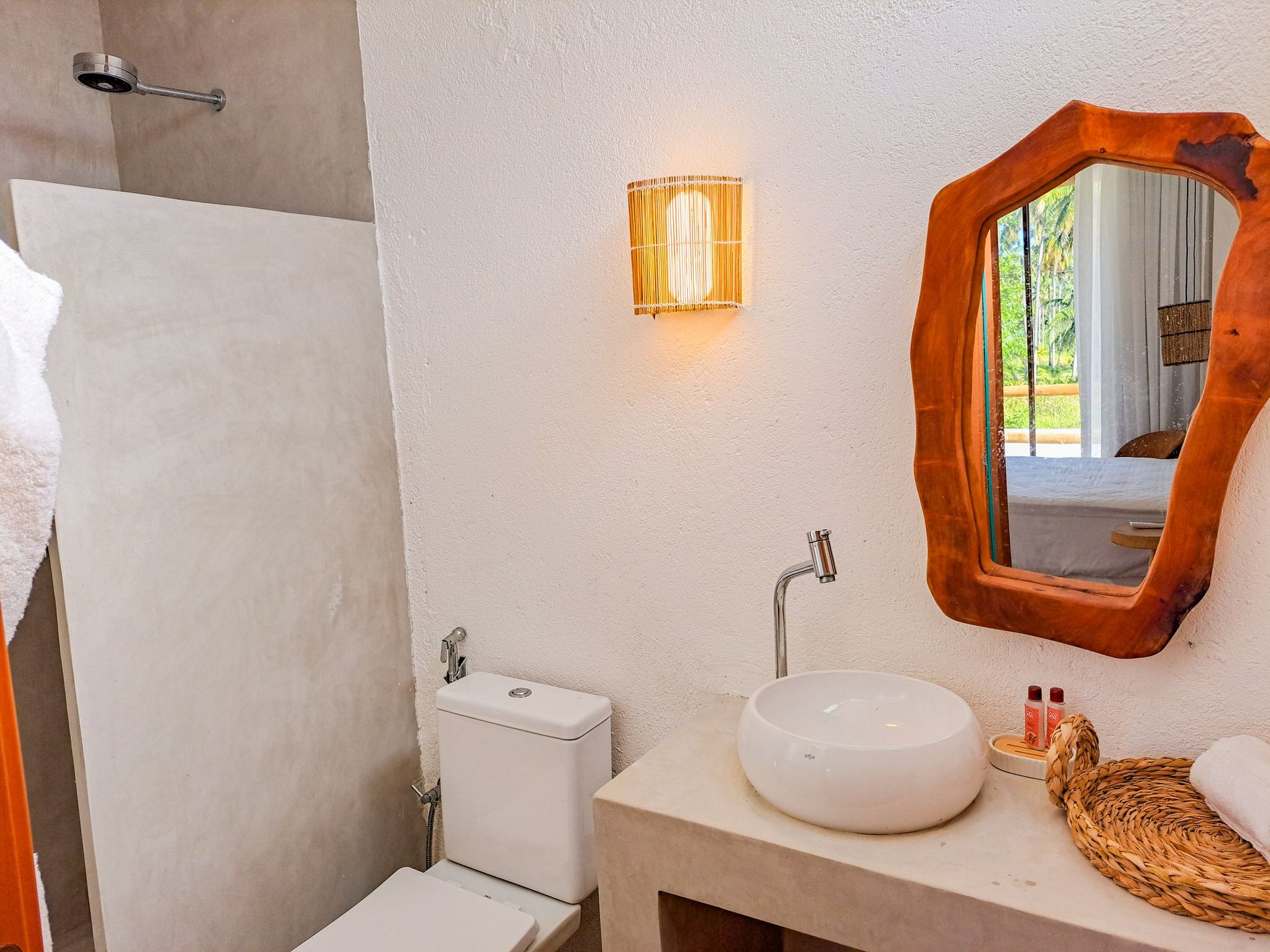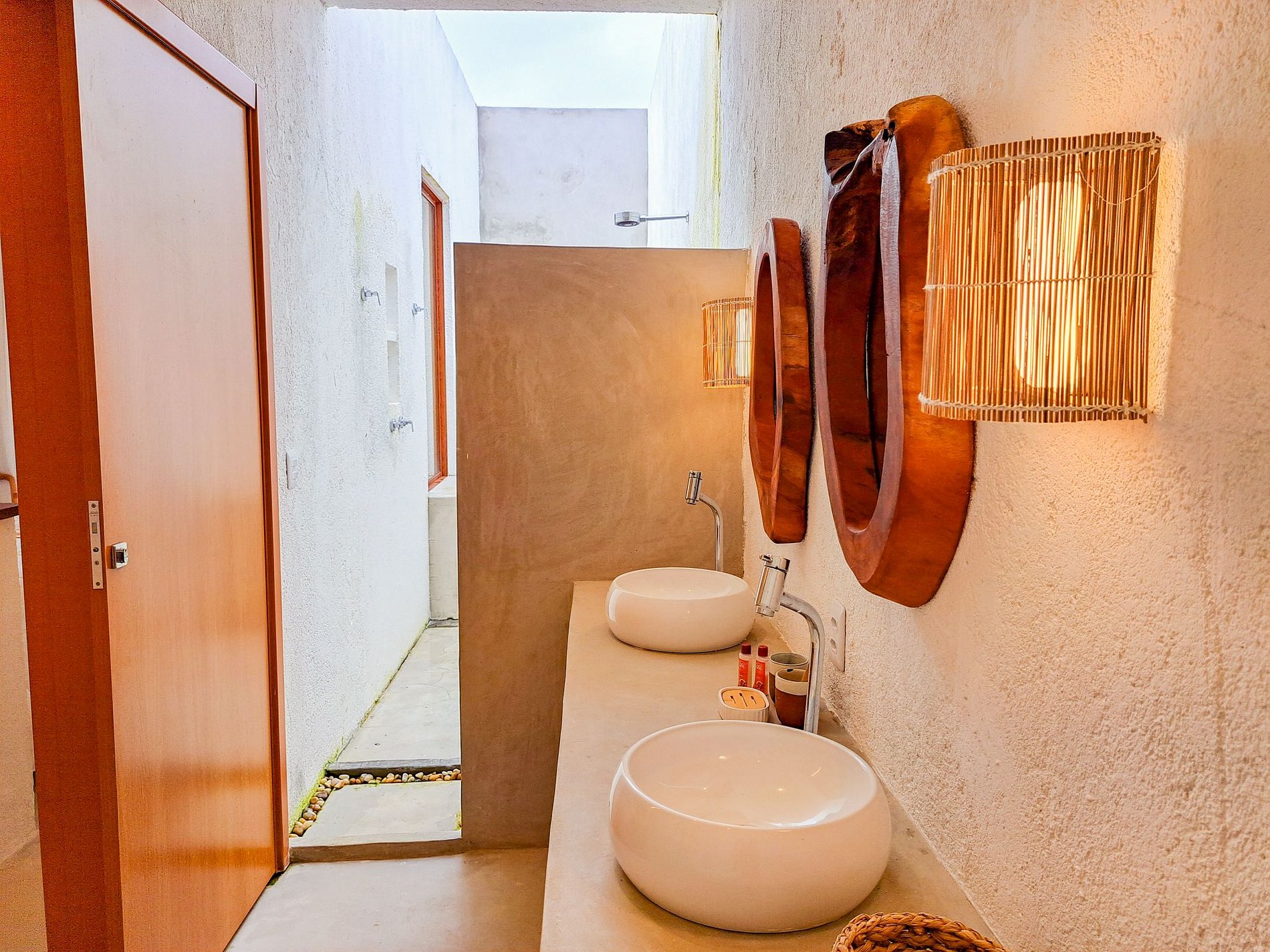 Suíte master com banheira e chuveiro ao ar livre.