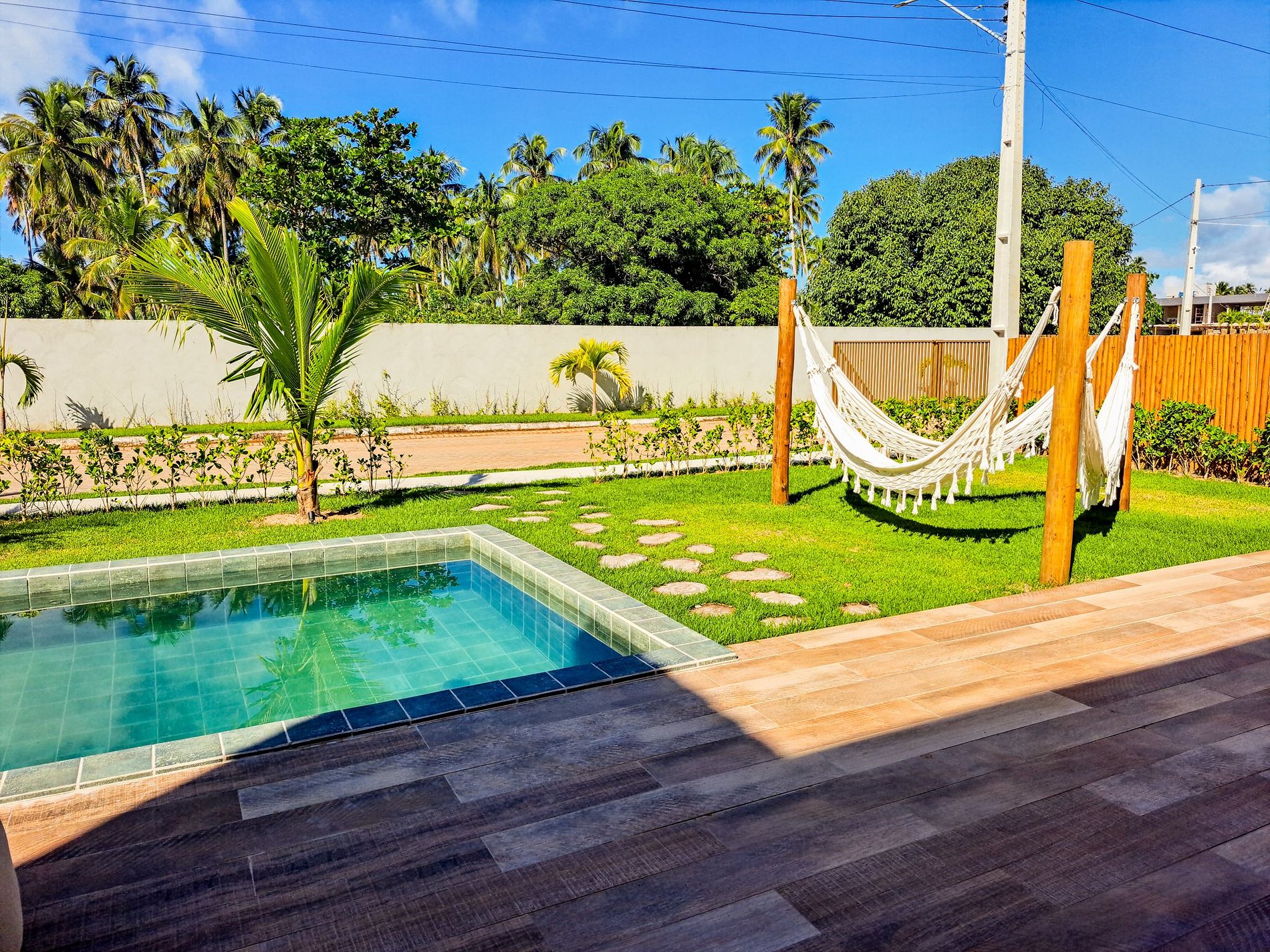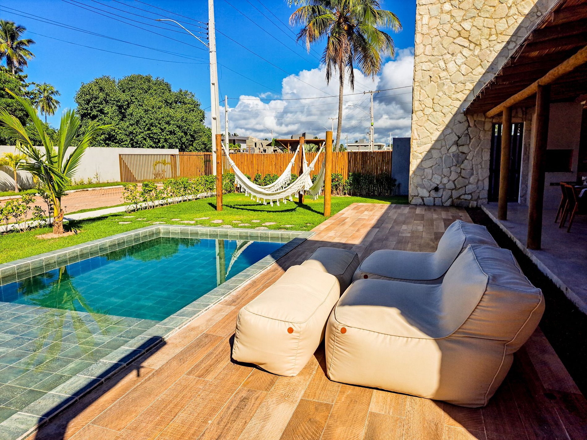 Área gourmet externa com uma bela piscina com deck, gramado e redário.
