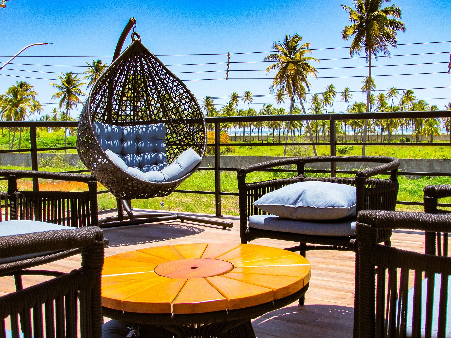 Rooftop amplo com mesa e cadeiras e um confortável balanço ninho para contemplar o por do sol