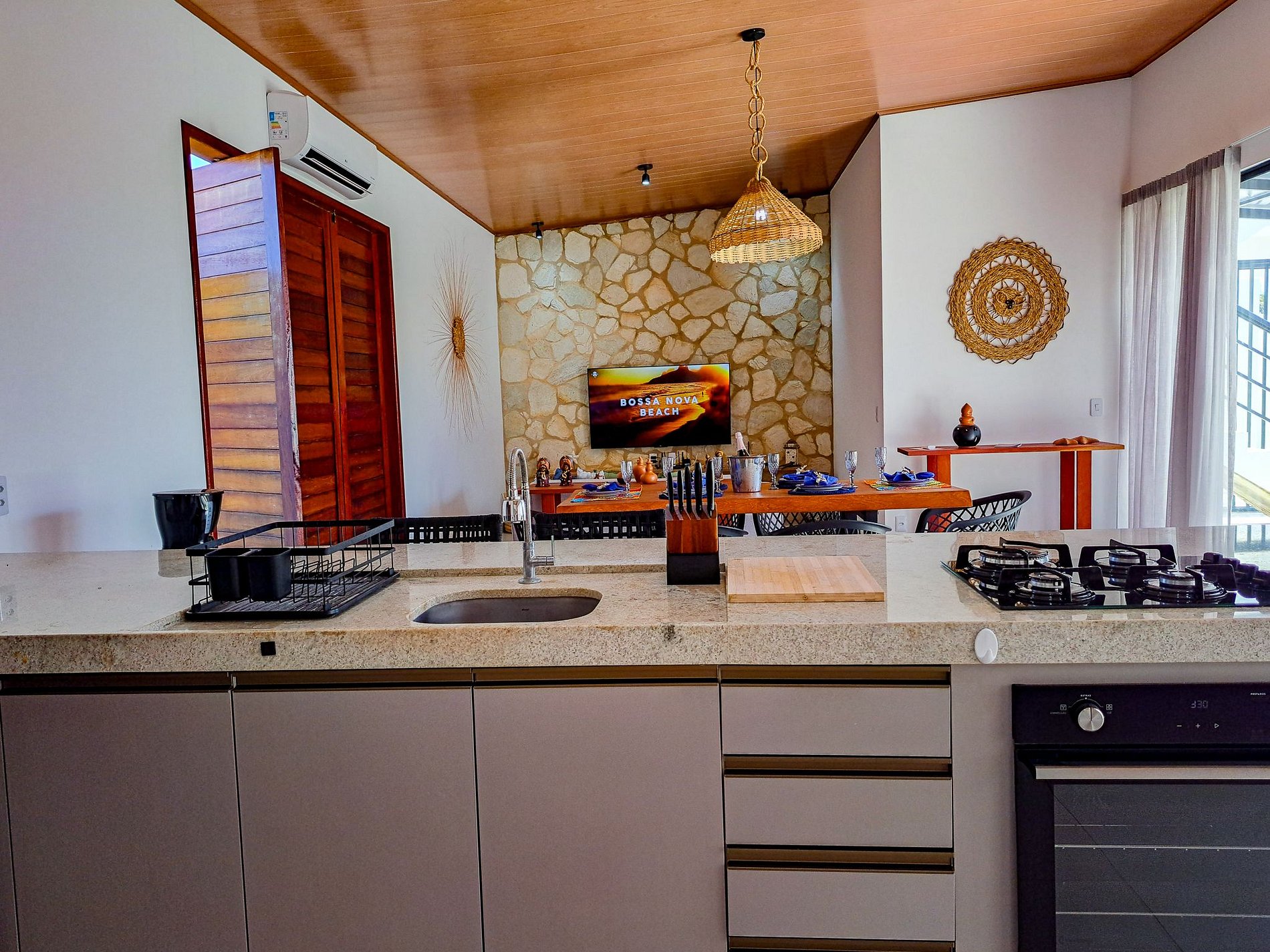 A cozinha é totalmente equipada, e você pode contratar nossas cozinheiras, especialistas em pratos locais e culinária brasileira, para a preparação de café da manhã, almoço e petiscos, que podem ser contratadas após a confirmação da reserva.