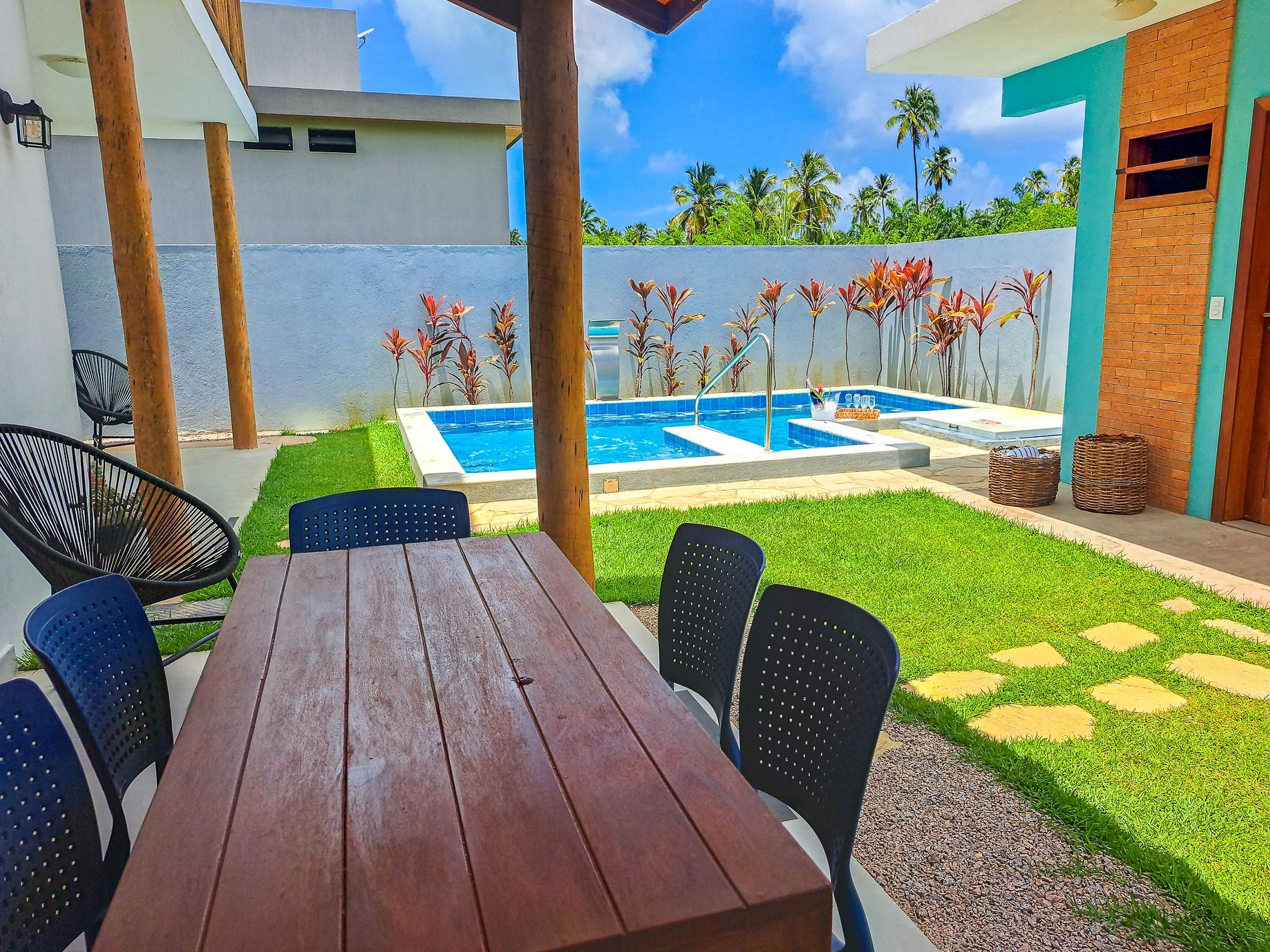 A piscina estava com bastante cloro e acabou manchando algumas roupas de banho (e cabelo!). O atendimento pelo WhatsApp nem sempre era muito agil. Nenhuma instrução sobre o check in como necessidade da identificação na portaria, onde localizar a casa dentro do condomínio e senha da porta errada (senha do Wi-Fi também, mas localizamos dentro da casa a senha correta). Seria legal também uma explicação de como chegar a praia. Apesar da quantidade de hóspedes confirmados, um colchão estava sem estar preparado e teve que alguma funcionária ir lá para ajustar já que não tinham lençóis extras disponíveis. Chegamos a noite e não tinha iluminação na casa e a da rua era bem fraca, foi um pouco preocupante que a senha não funcionou, e só foi reconhecido o erro quando enviamos um vídeo mostrando que a senha não abriu. Sentimos falta também de taças para gin.
